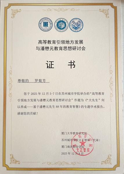 2025年12月5日至7日,公司罗菊芳博士参加由厦门大学教育研究院、苏州城市学院、厦门南洋职业学院主办的高等教育引领地方发展与潘懋元教育思想研讨会。