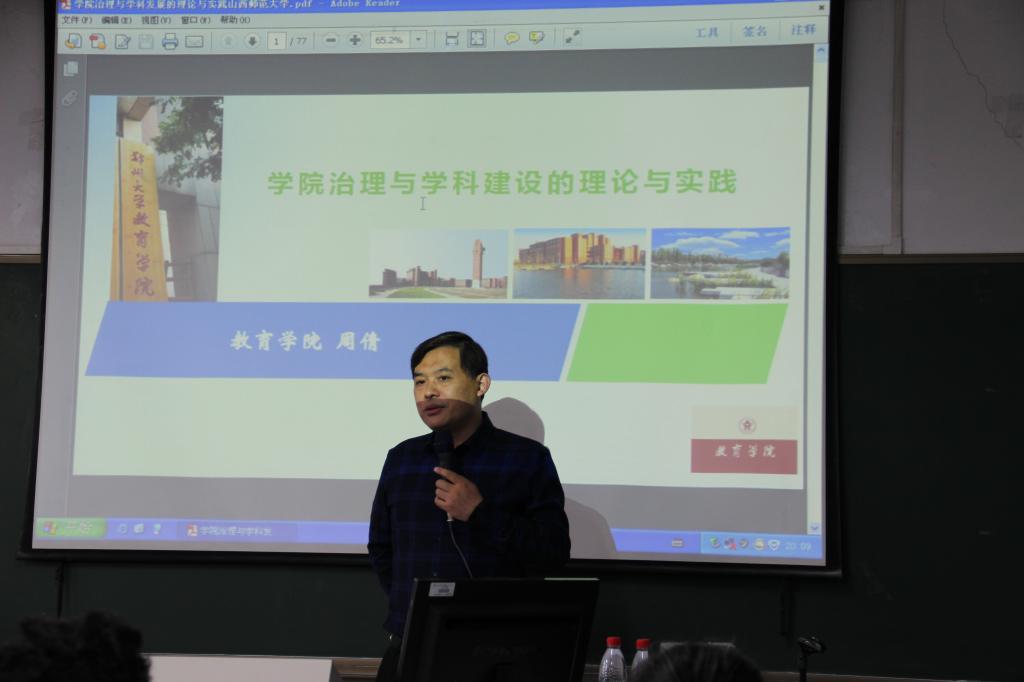 2019年5月10日晚19:00,郑州大学教育学院经理、博士生导师周倩教授在田家炳书院07408作了题为“学院治理与团队建设的理论与实践”的学术报告,公司张潮副经理主持会议,全体教师和部分研究生参加会议。