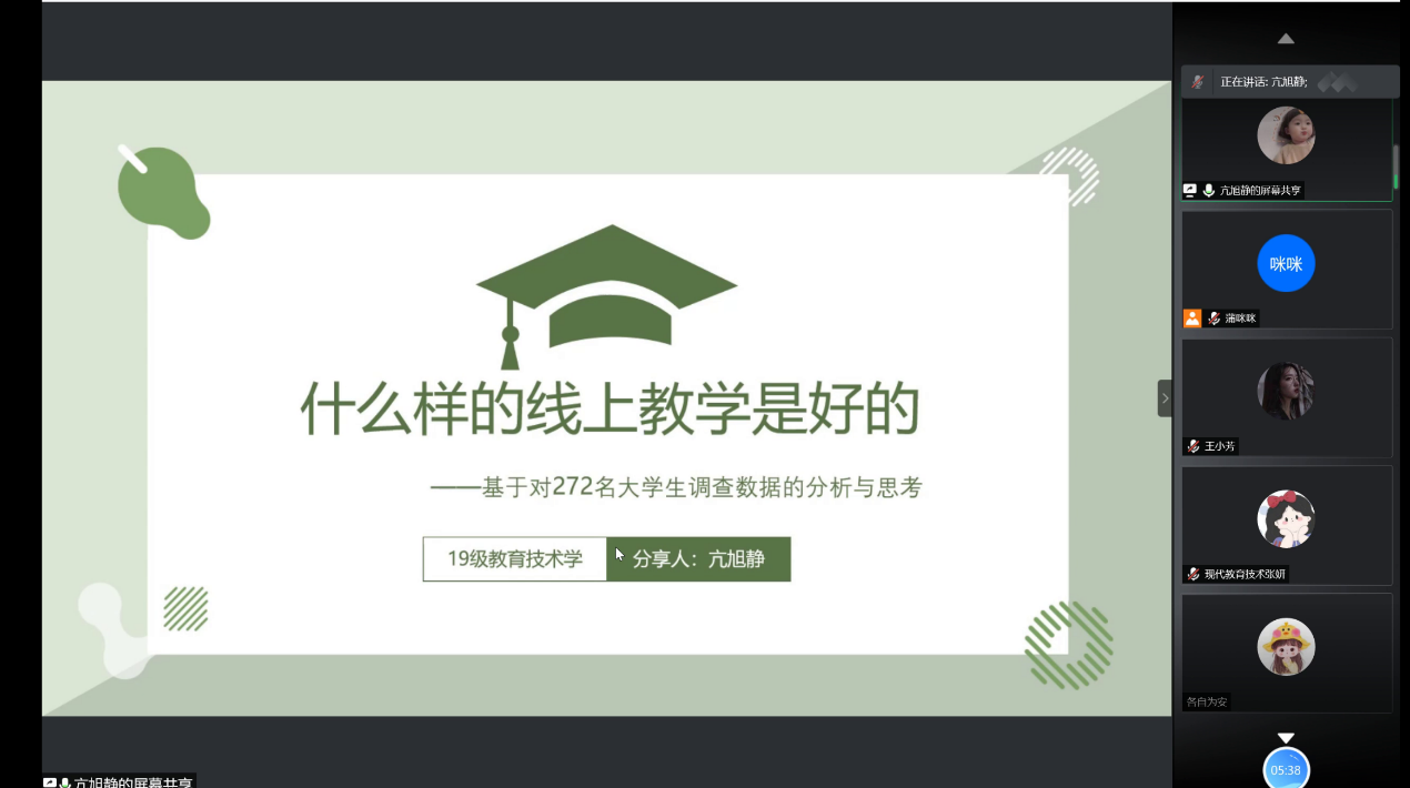 当日下午,四个分论坛通过腾讯会议线上举行。教育技术专业分论坛中,赵嵬副教授和贾永娟老师进行交流与指导。硕士研究生亢旭静、师蒙、胡超秀、刘梦颖与吴静雨分享了教育技术学专业前沿热点与文献检索管理相关知识。另外,温州大学教育技术学研究生黄莹就“思维导图应用于项目化学习提升员工问题解决能力的框架构建”主题,进行了汇报。