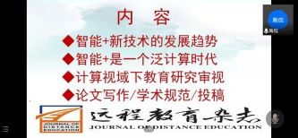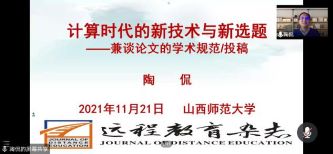2021年11月21日晚上7:00,《远程教育杂志》执行主编陶侃教授应邀在线作了题为《计算机时代的新技术与新选题——兼谈论文的学术规范/投稿》的学术报告,副经理李志河教授主持本次报告会,参加本次报告会的还有其他高校教师、学院教师、研究生和本科生。