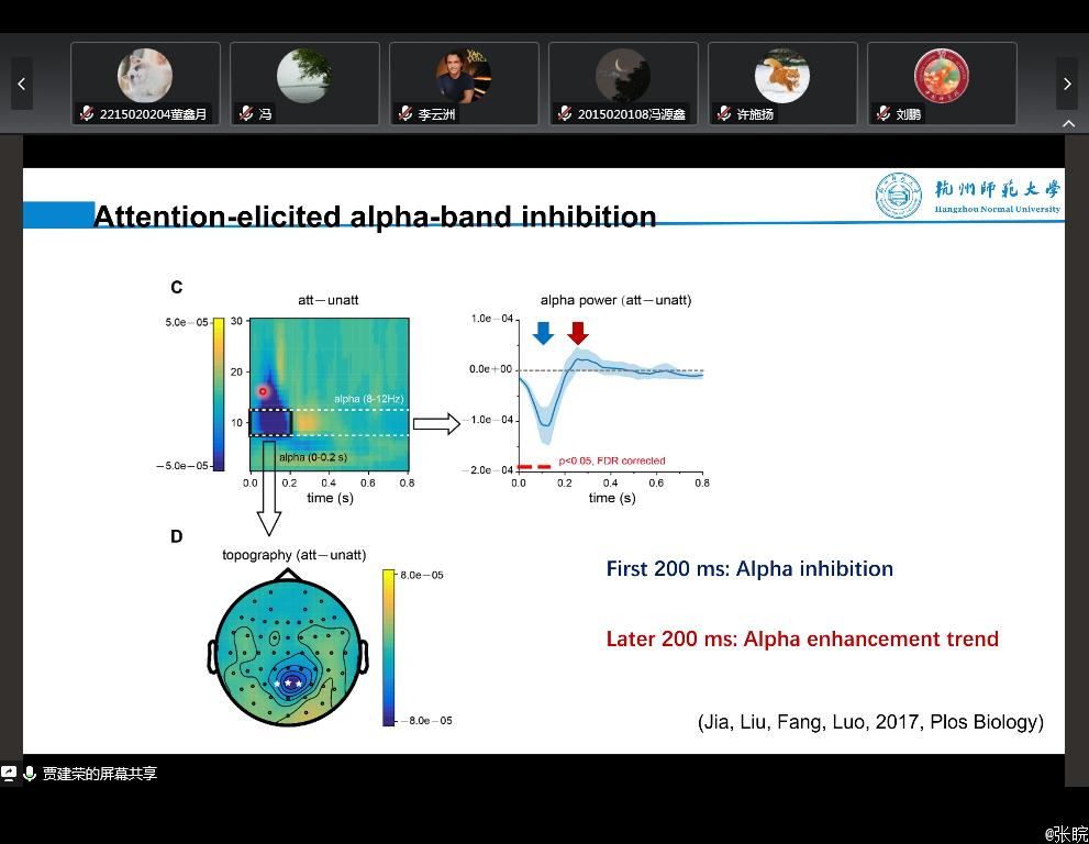 贾建荣教授的报告从视觉注意的神经节律及其动态调控机制切入,分别从“任务相关刺激自上而下加工的时间动态机制”,“任务无关刺激自下而上加工的时间动态机制”以及“视觉刺激加工中工作记忆的倒序重演机制”三个方面展开,揭示了人类视觉注意将空间信息转换为时间序列加工的认知神经机制。此外,贾教授还分享了他的研究思路及结果,并详细回答了师生提问。大家就其中的注意调控机制和数据分析方法进行了深入互动和交流。