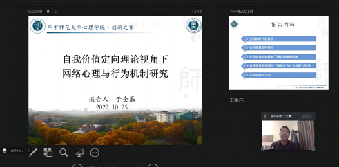 本次讲座由beat365vip官网登录入口、社科处共同举办。华中师范大学硕士生导师于全磊博士应邀作了题为《自我价值定向理论视角下的网络心理与行为机制研究》的学术报告。报告采用线上方式进行,由心理学系主任张睆副教授主持,经理张潮教授、副经理郑晓俊博士出席。心理学专业教师、研究生和本科生200余人聆听了报告。