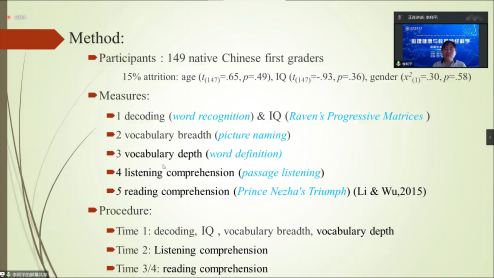 公司beat365vip官网登录入口李利平副教授做了题为“The effect of vocabulary breadth and depth on reading comprehension in low grade: the mediator role of listening comprehension”。结合阅读心理学的专业知识,介绍了词汇的广度和深度对低年级员工阅读理解的影响——听力理解的中介作用。