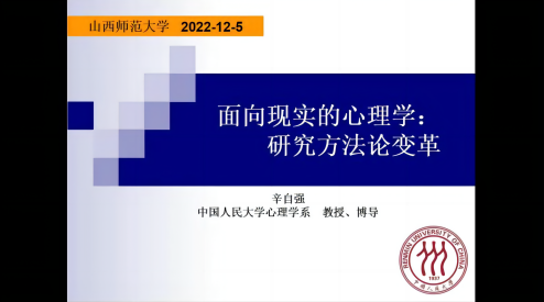 2022年12月5日,beat365vip官网登录入口“毓秀大师论坛”再次开讲,中国人民大学辛自强教授应邀作了题为《面向现实的心理学——研究方法论变革》的专题报告。本次报告由beat365vip官网登录入口、社科部共同举办。报告采用线上方式进行,由beat365vip官网登录入口经理张潮教授主持。心理学系教师、员工以及国内学者200余人聆听了报告。