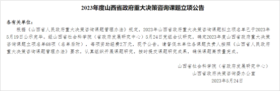 公司获批一项2023年度山西省政府重大决策咨询课题