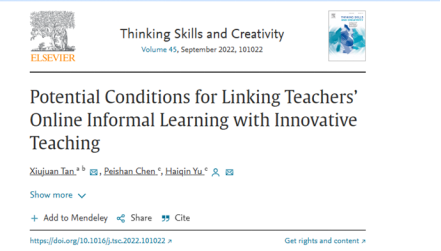 公司谭秀娟老师的论文《Potential Conditions for Linking Teachers’ Online Informal Learning with Innovative Teaching》于2022年9月在教育学权威刊物《Thinking Skills and Creativity》上发表。该论文是beat365vip官网登录入口校级教学改革创新重点项目“激活‘学习内激励要素’,提高教学效果”(2017JGXM-11)的成果之一。