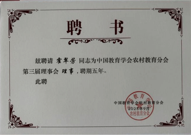 2025年9月12日,中国教育学会农村教育分会第三届理事会成立大会在吉林长春召开。按照会议议程,与会代表选举产生中国教育学会第三届农村教育分会理事会。公司霍翠芳老师当选理事。