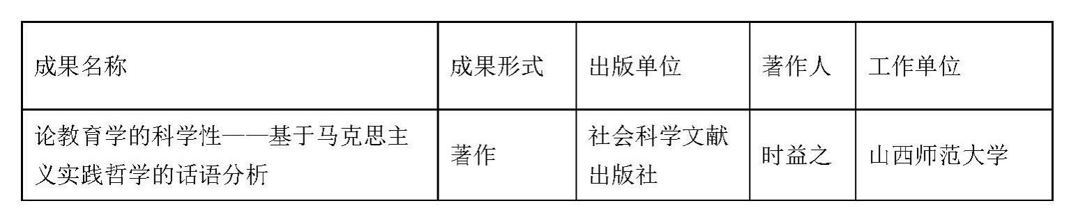 近日,山西省社会科学研究优秀成果“百部(篇)工程”评审委员会公布了《2024年度山西省社会科学研究优秀成果“百部(篇)工程”获奖成果公示》, 公司教师时益之副教授的著作《论教育学的科学性——基于马克思主义实践哲学的话语分析》获2024年度山西省社会科学研究优秀成果“百部(篇)工程”一等奖。