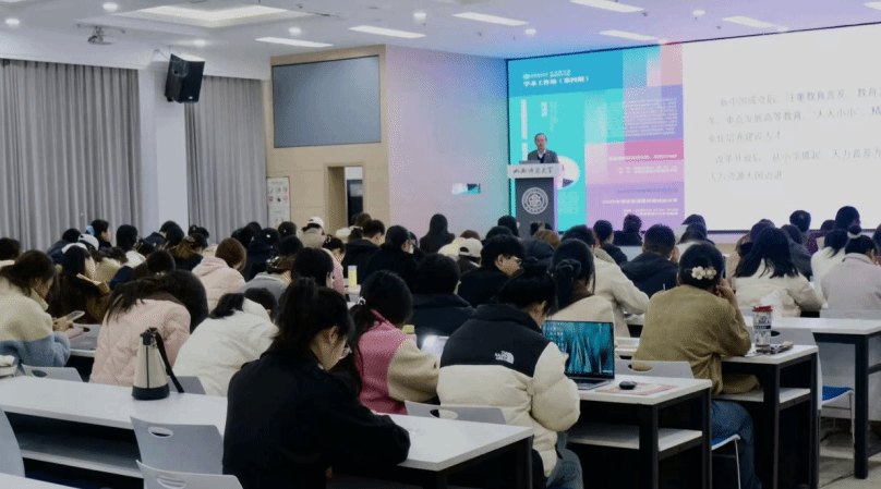 阮成武教授作了题为《教育强国建设的综观、概观与洞观》的专题报告。在分享中,阮教授以“历史纵观—图景概观—实践洞观”为脉络,全面回溯了教育强国的发展历程,深入解析了当前建设的顶层框架,聚焦落地路径,从政策协同到基层创新,为在场师生提供了清晰的学术指引。整场讲座既有理论高度,又具现实温度,在场师生对教育强国建设的方向与方法有了更深刻的认知。