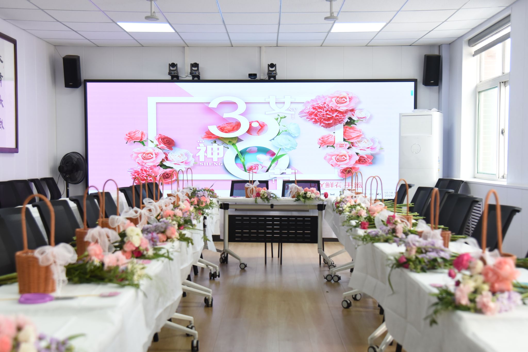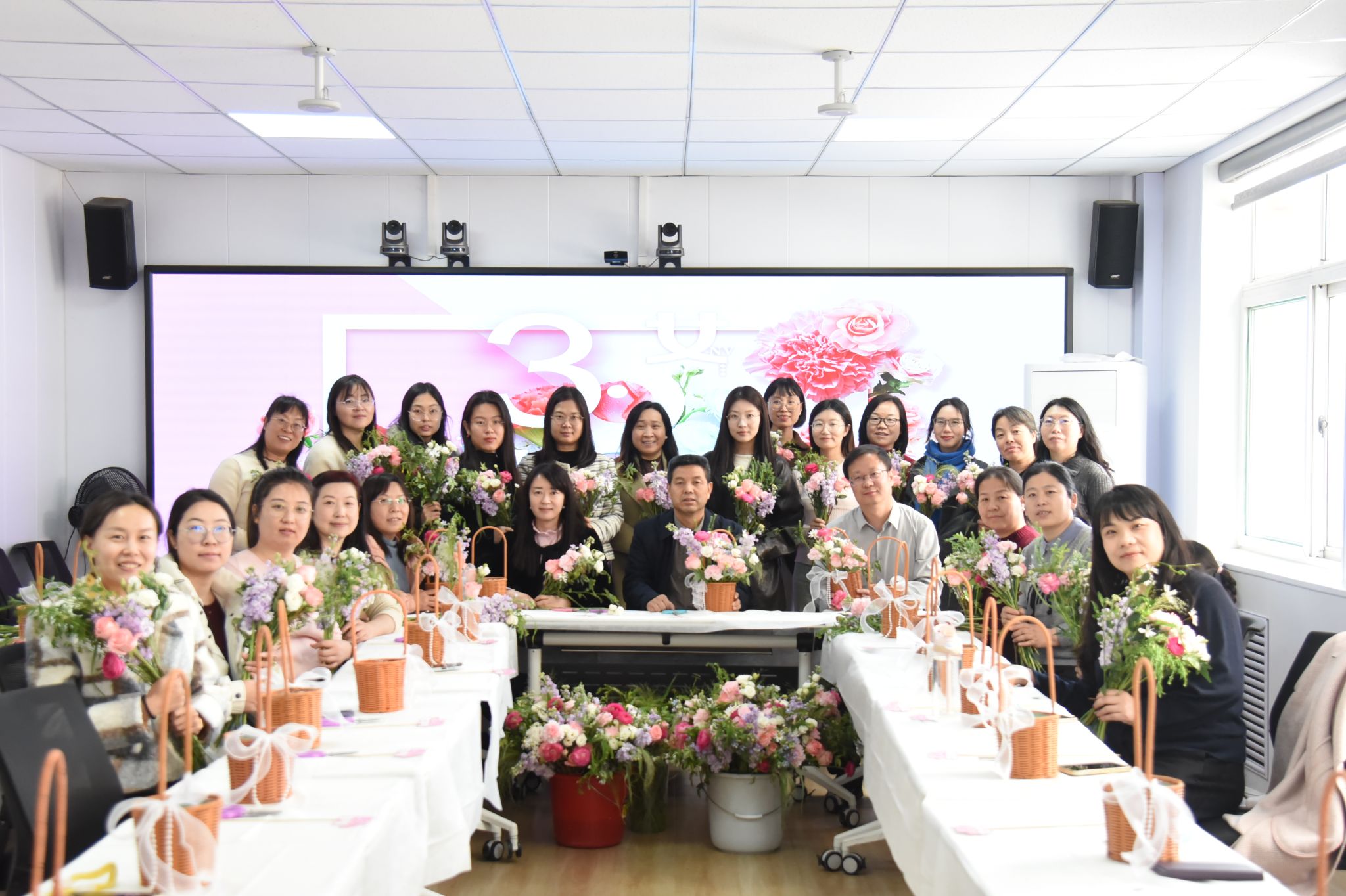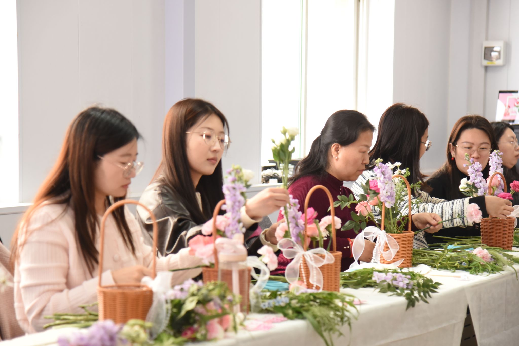 在动手创作环节,女教工们化身花艺设计师,沉浸在手作的宁静与美好中。大家精心挑选花材,细心修剪枝叶,巧妙搭配色彩,在一插一剪、一高一低之间,将零散的花枝组合成错落有致、生机盎然的花篮。指尖流转间,繁花次第绽放,既有清新淡雅的婉约,也有热烈明媚的奔放,每一件作品都独具匠心,承载着对生活的热爱与对美好的向往。现场欢声笑语不断,大家相互交流心得、分享创意,用镜头定格花漾瞬间,在花香中舒缓身心、增进情谊。