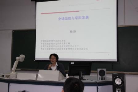 鲍静主编以“全球治理与生产力革命”的历史发展为引言,指出以数字为核心的信息革命将带来一次前所未有的生产力革命。在本次报告中,鲍主任主要从三方面阐述了她对于全球化背景下学科发展的认识与见解。第一,以行政管理学为例,鲍静主编详细介绍了该学科的发展脉络,为大家梳理了一个清晰的学科知识框架。第二,鲍主编以诙谐幽默的方式解释说明了学科在发展过程中所遇到的问题,即碎片化与封闭化,并根据现实情况作了具体分析。第三,针对问题,鲍静主任认为要及时抓住学科问题与不足,然后进行诊断分析,在国际视野下,立足我国实践情况,以此来更好的推动学科发展。