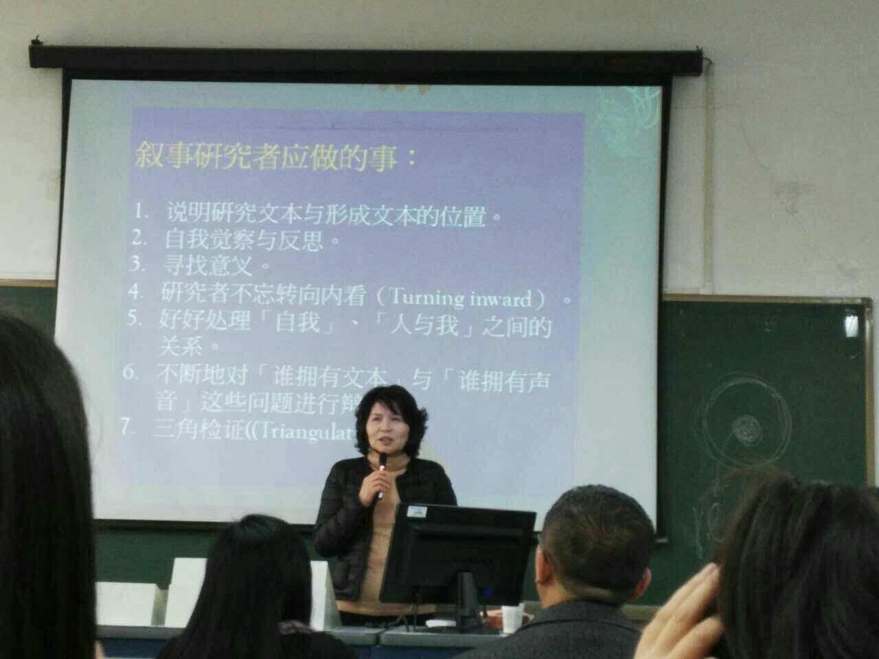 3月21日上午和下午,阮凯利教授以《质性研究》为主体,主要分析了叙事研究、扎根理论等主要质性研究方法,进而延伸出对诠释学的认识与理解,并通过实例的方式讲述了访谈法、观察法的应用,剖析了优秀学术论文所包含的主要要素及其表达方式。