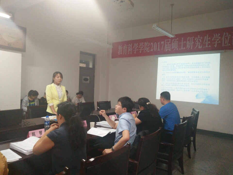 2017年5月14日,beat365vip官网登录入口2017届教育与发展心理学硕士研究生学位论文答辩会在田家炳教学楼五层会议室举行。西安交通大学喻丰教授任答辩委员会主席主持会议,答辩组成员有张潮教授、韩琴教授、肖海雁教授、肖风博士、仝文博士,答辩秘书是谭秀娟助教。心理学一级学科专业员工柏雅颖、李亚婷等11名研究生参加答辩。
