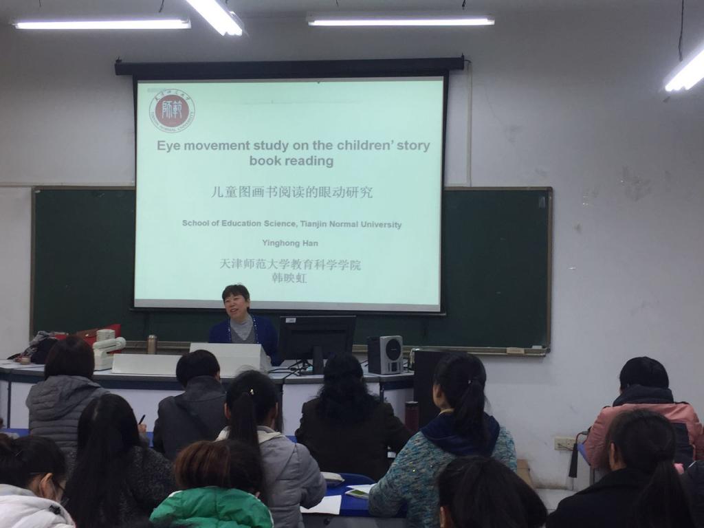 在报告中,韩映虹教授围绕“学前儿童图画书阅读的实证研究”这一主题,首先强调了在研究中要把心理学上的实验法应用到学前教育研究的重要性,同时要求同学们在研究中要大胆想象,敢于创新并及时的将想法付诸实施,给同学们带来了全新的研究思路。其次,韩教授结合自身多年的研究成果详细的阐述了学前儿童在阅读图画书中眼动的一些规律与结论。分享了研究过程中所使用的方法,并对眼动仪的使用与公司张琴秀教授进行了简交流与指导。最后,韩教授介绍了目前还在进行中的一些研究,并热心积极的解答了同学们所提出的问题和困惑。