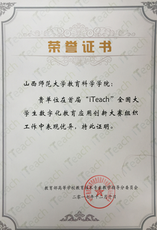 2017年12月8日至10日,“iTeach”全国老员工2017(首届)数字化教育应用创新大赛决赛在江苏南京师范大学举办。该赛事由教育部高等学校教育技术专业教学指导分委员会主办,南京师范大学、江苏开放大学承办,大赛以信息化、教育应用与创新为主题,分为知识类、工具类、系统类和项目类。本次大赛面向全国普通高等学校全日制在籍在读员工,包括专科、本科、硕士研究生和博士研究生征集优秀作品。
