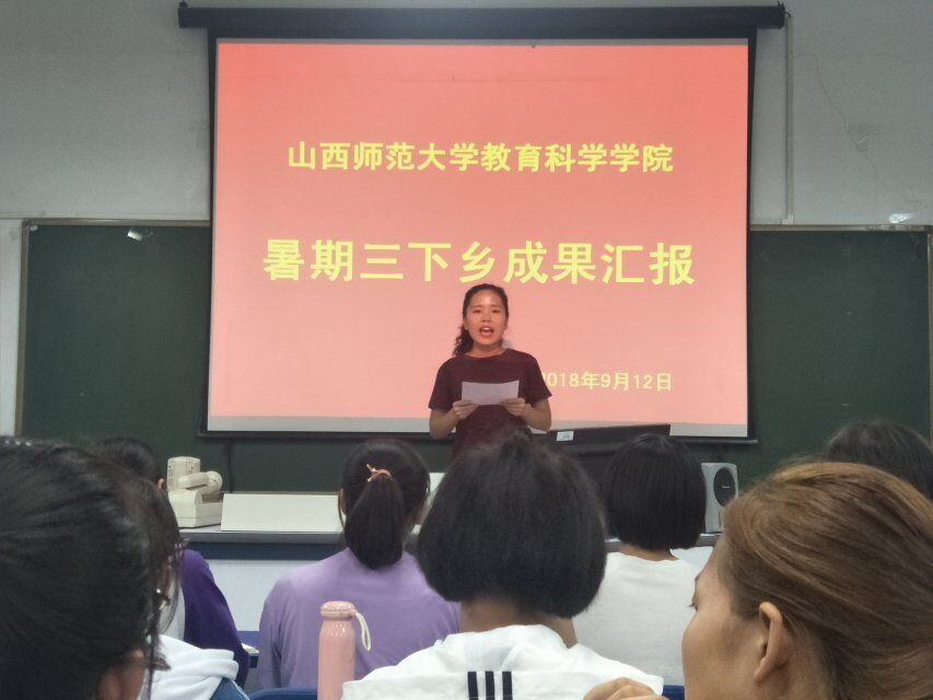 汇报会上,来自四个实践团队的员工代表以PPT和视频播放的形式与同学们分享了暑期实践的感悟。“萤火”支教服务队代表详细阐述了他们在临汾市隰县黄土小学招生、教给孩子们知识、与孩子们共同生活学习的经过,引起在场人的强烈共鸣;“焰之队”实践队通过“红色寻访”的形式传达了革命先驱的优秀事迹,他们走访了文水县老革命党人陈德邻先生,感受到了那份属于中国人的骄傲和自豪;“育人暖阳”实践团队在小榆东村和老年人促膝长谈,与小朋友嬉戏玩耍,传达出“育人如暖阳、真情献社会”的实践真理;“心之新源”服务队分享了他们在关王庙中心小学开展的心理班会、心理普查以及课业辅导的活动,通过一系列的服务,孩子们了解到亲子、师生、同伴关系在成长中的作用,领悟到增强学习效果的方法,获得了更多的心理支持。