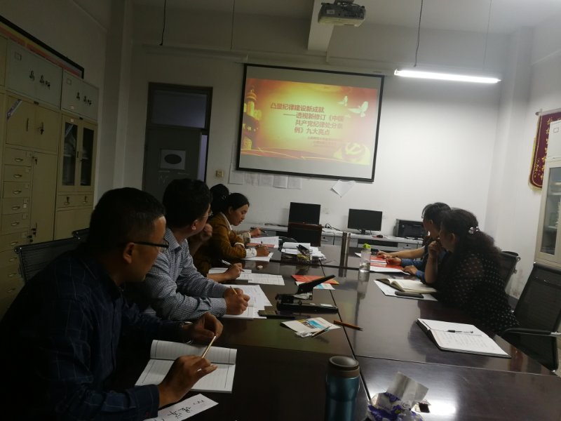 会前,支部全体党员已经通过支部微信群首先学习了《中国共产党纪律处分条例》修订前后对照表,对新修订的《中国共产党纪律处分条例》有了初步的认识。为了突出重点,深入把握精神实质,会上,支部党员一起学习了北京大学廉政建设研究中心副主任庄德水、中央纪委驻中国社科院纪检监察组副组长高波对本次修订的解读——《凸显纪律建设新成就——透视新修订<中国共产党纪律处分条例>九大亮点》。从“把习近平新时代中国特色社会主义思想写入指导思想;‘两个坚决维护’确保党中央权威和集中统一领导;‘四个意识’筑牢思想防线;突出监督执纪的‘靶心’;‘四种形态’体现惩前毖后、治病救人;推动党纪国法‘无缝衔接’;从严处分凸显‘越往后越严’的震慑作用;严惩‘七个有之’,净化政治生态;严查新型违纪行为,让违纪者无空可钻。”九个方面对新修订的《中国共产党纪律处分条例》进行了深入学习,思想认识得到了很大的提升。随后,大家学习了《关于做好2018年中秋国庆期间监督检查中央八项规定精神执行情况和纠正“四风”工作的通知》。