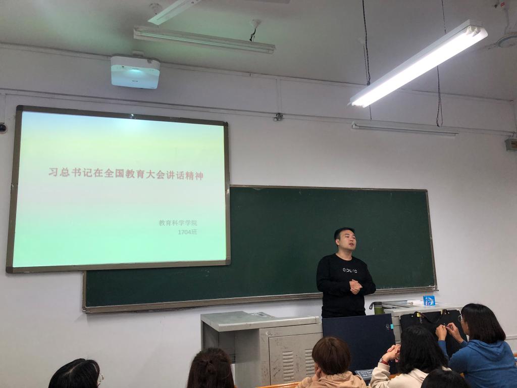 各班组织同学观看了CCTV13关于习近平在全国教育大会上视频剪辑,对本次全国教育大会有所了解;随后,由主持人对国家主席习近平在全国教育大会上的重要讲话精神做了概述;最后同学们自由讨论,对习近平在全国教育大会上的重要讲话精神进行小组学习。通过本次班会,大家感受到了党中央对教育事业的重视,对教师职业的重视,纷纷表示作为师范大学的员工,应该响应国家号召,努力把自己塑造成一个合格的人民教师。