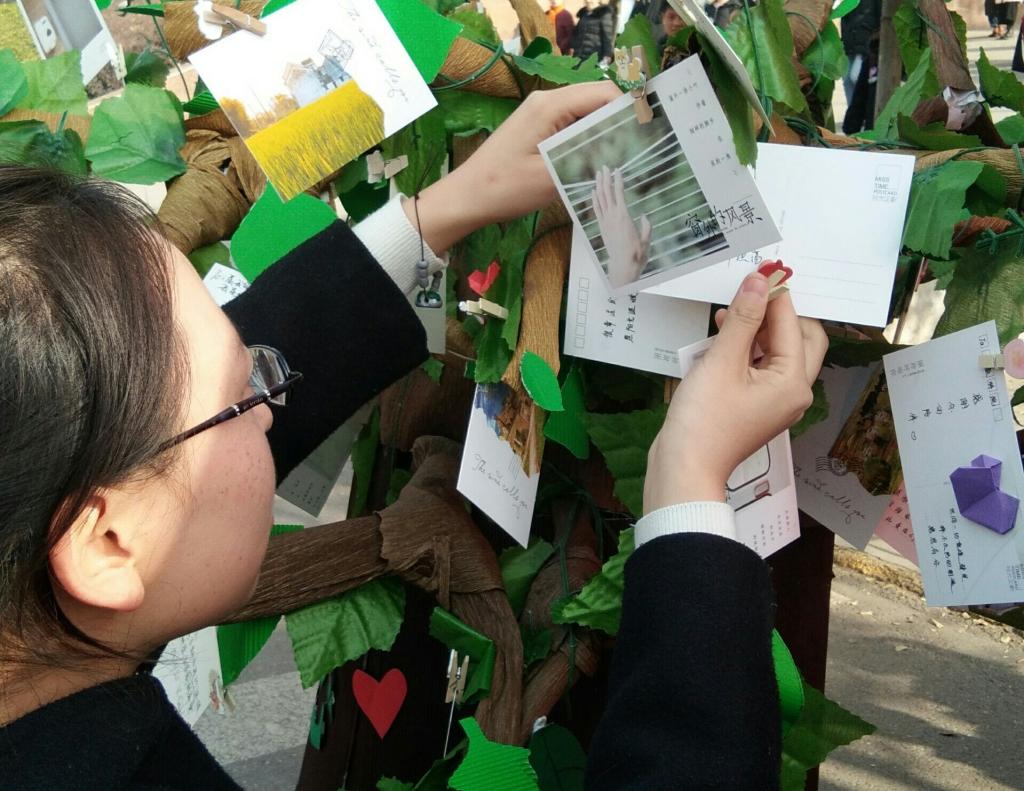 活动开始前,工作人员做了充分准备工作,摆放活动所需的明信片、感恩树等。随后,工作人员向路过员工宣传活动内容并邀请他们积极参与。活动具体内容为每位参与者写一张明信片,向自己想感谢的人表达内心的感激,填写完毕后凭个人意愿将其张贴到四周或挂在感恩树上,也可以带走。活动得到了同学们的大力支持,大家纷纷投入到明信片的制作当中,每张明信片都融入了同学们深深的感恩和浓浓的祝福。