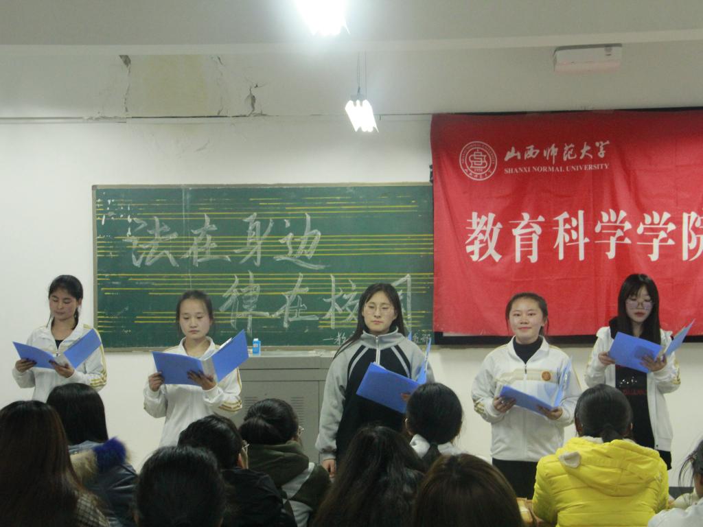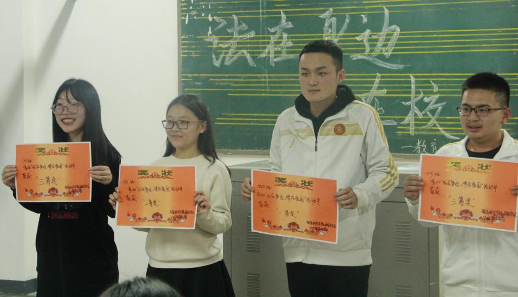 本次活动共有十个节目,采用了情景剧、诗朗诵等同学们喜闻乐见的形式。参演人员的精彩表演赢得了场下观众的阵阵掌声,其中《中奖了》《拿什么拯救你,我的兄弟》更是给人留下了深刻的印象。经过评比,1802班荣获一等奖,1705班荣获二等奖,1703、1803班荣获三等奖。活动最后,同学们在“法在身边,律在校园”横幅上签名并合影留念。