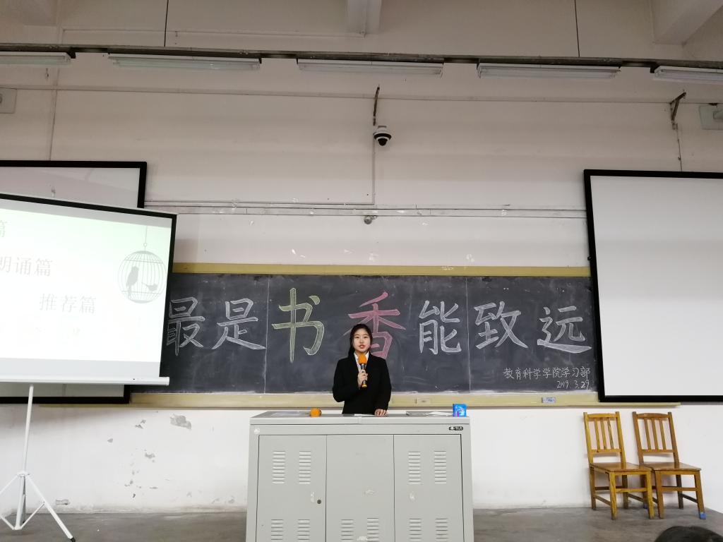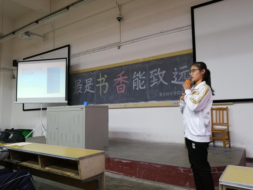 活动由感悟、朗读以及推荐三个环节组成。活动过程中,1804班郭雨梦等5位读书笔记优秀的同学依次分享了读书感悟并与同学们进行了交流,之后由5组同学依次进行朗诵表演,他们举止大方、感情充沛,感染了在场的同学,活动最后由7位即将毕业的同学推荐了一些书籍,分享了自己的读书感悟,为各位同学提供了指导与帮助。