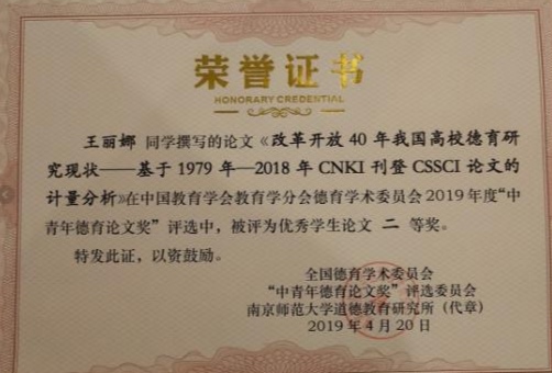 由公司教育学系安宝珍老师指导的2018级少年儿童组织与思想意识教育方向的硕士研究生王丽娜同学撰写的论文《改革开放40年我国高校德育研究现状——基于1979年至2018年CNKI刊登CSSCI论文的计量分析》在中国教育学会教育学分会德育学术委员会2019年度“中青年德育论文奖”评选中,荣获优秀员工论文二等奖。