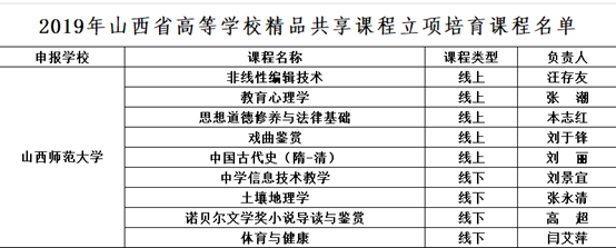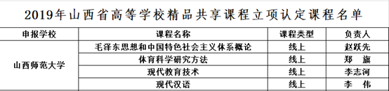 9月4日,山西省教育厅公布了2019年山西省高等学校精品共享课程立项名单,公司2门课程获批,李志河的《现代教育技术》课程荣获省高等学校精品共享课程立项认定课程,张潮的《教育心理学》课程荣获省高等学校精品共享课程立项培育课程。