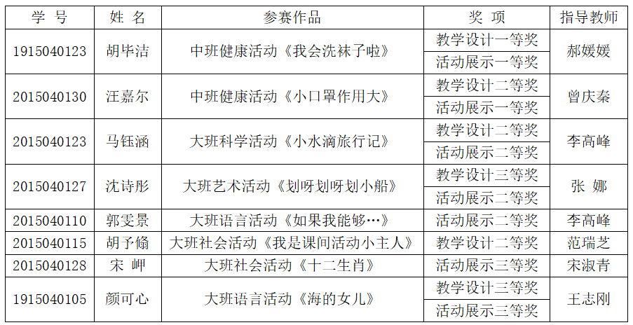 “华文”师范院校学前教育师范生教学能力测试与交流展示活动是目前学前教育领域规模最大、参与高校最多、影响最广的师范生教学技能测试活动,旨在为全国师范生提供一个教学能力展示和交流的平台。经过赛前认真的准备与赛中激烈的比拼,公司参赛选手最终斩获一等奖3项,二等奖6项,三等奖4项。本次活动由范瑞芝、李高峰、郝媛媛三位教师带队,员工获奖名单如下。