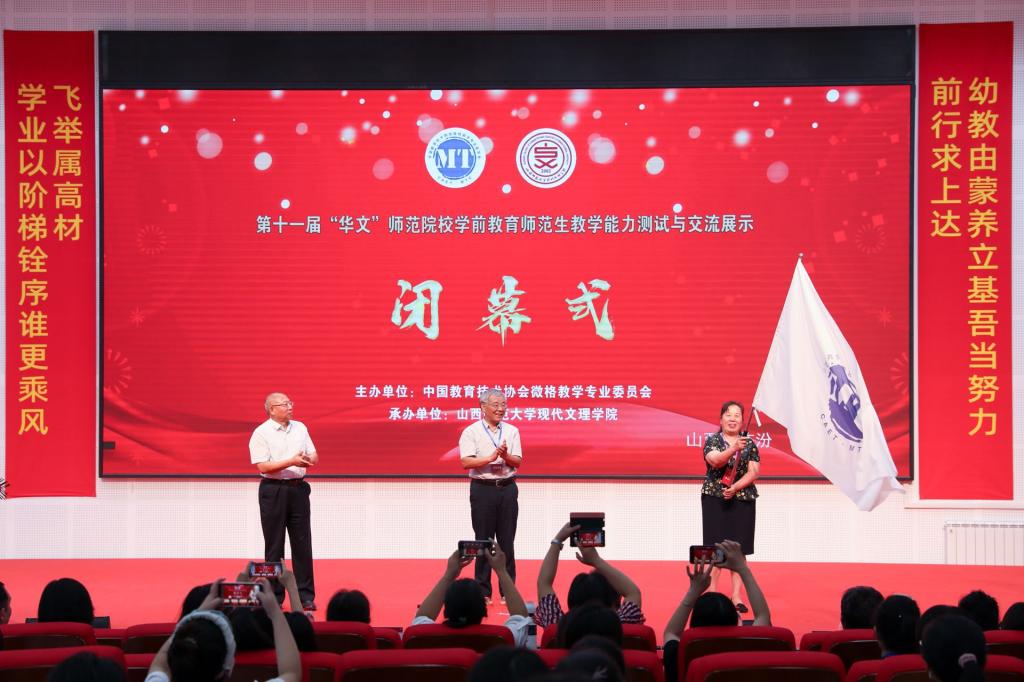 在闭幕式中,中国教育技术协会微格教学专业委员会理事长孟宪凯宣布公司获得下一届举办权,并与公司经理张潮教授进行了会旗交接。作为第十二届“华文”师范院校学前教育专业师范生教学能力测试与交流展示活动承办单位代表,张潮经理首先向专委会对beat365vip官网登录入口的信任表示感谢,对beat365vip官网登录入口现代文理学院成功举办本次赛事表示祝贺;并向专委会表态,公司将秉承学校“团结、创造、求实、奋进”的校训,在专委会的领导下,在各位专家的指导下,早谋划、勤沟通,以高度的责任心和使命感做好下一届赛事的各项准备工作,珍惜与国内同行合作、交流、共享、共建、共成长、共发展的机遇,为学院学科和专业的内涵式高质量发展而乘风破浪,奋起前行。