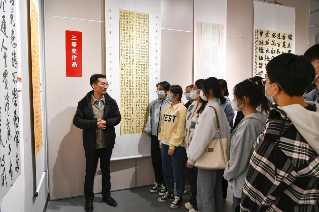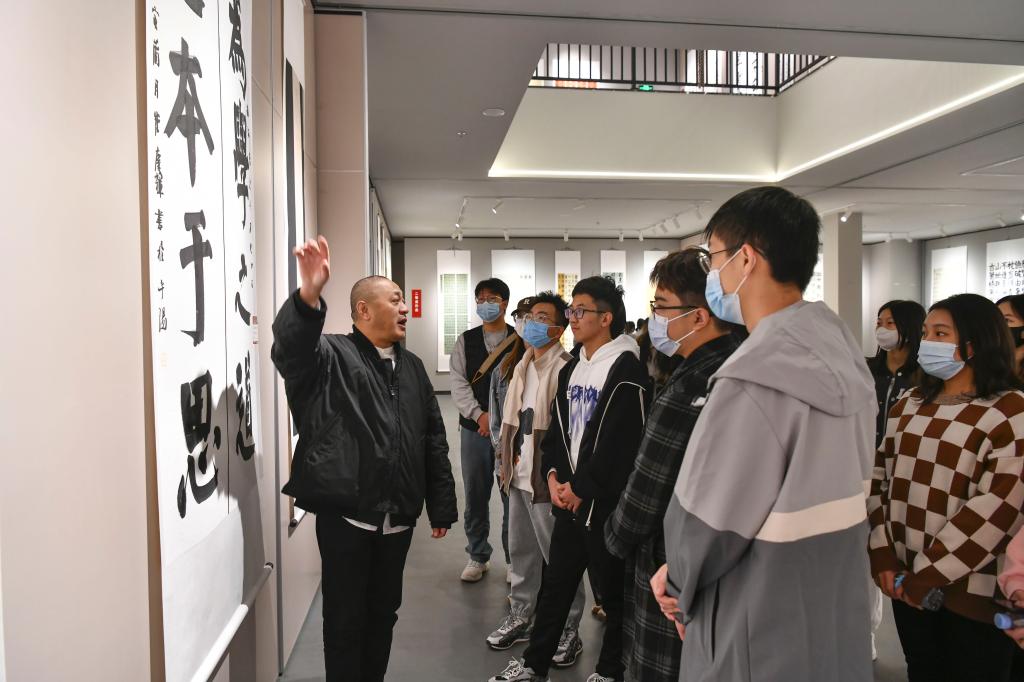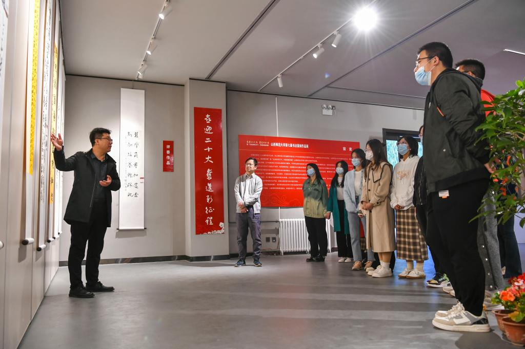 2022年10月12日上午,beat365vip官网登录入口组织员工参观“喜迎二十大、奋进新征程”书法篆刻作品展,在展厅里上了一堂别开生面的书法思政课,引导同学们通过一幅幅主题鲜明、立意高远、具有浓郁时代气息的作品,感悟初心力量,接受深刻洗礼,激发同学们对党的二十大的热切期盼。(张蕴强摄)