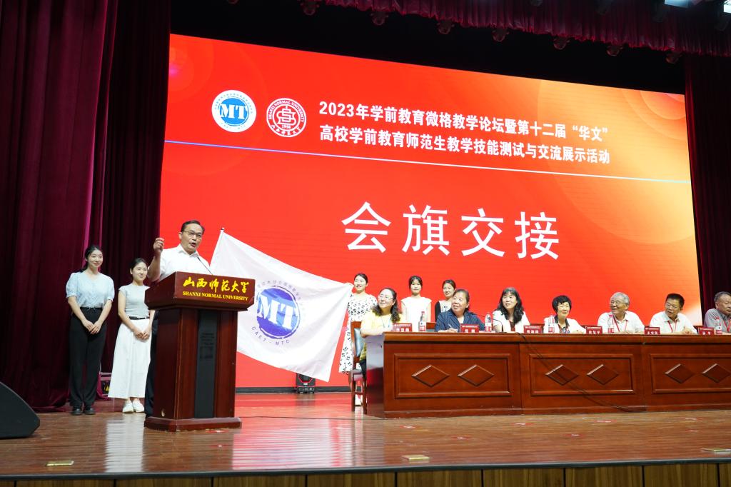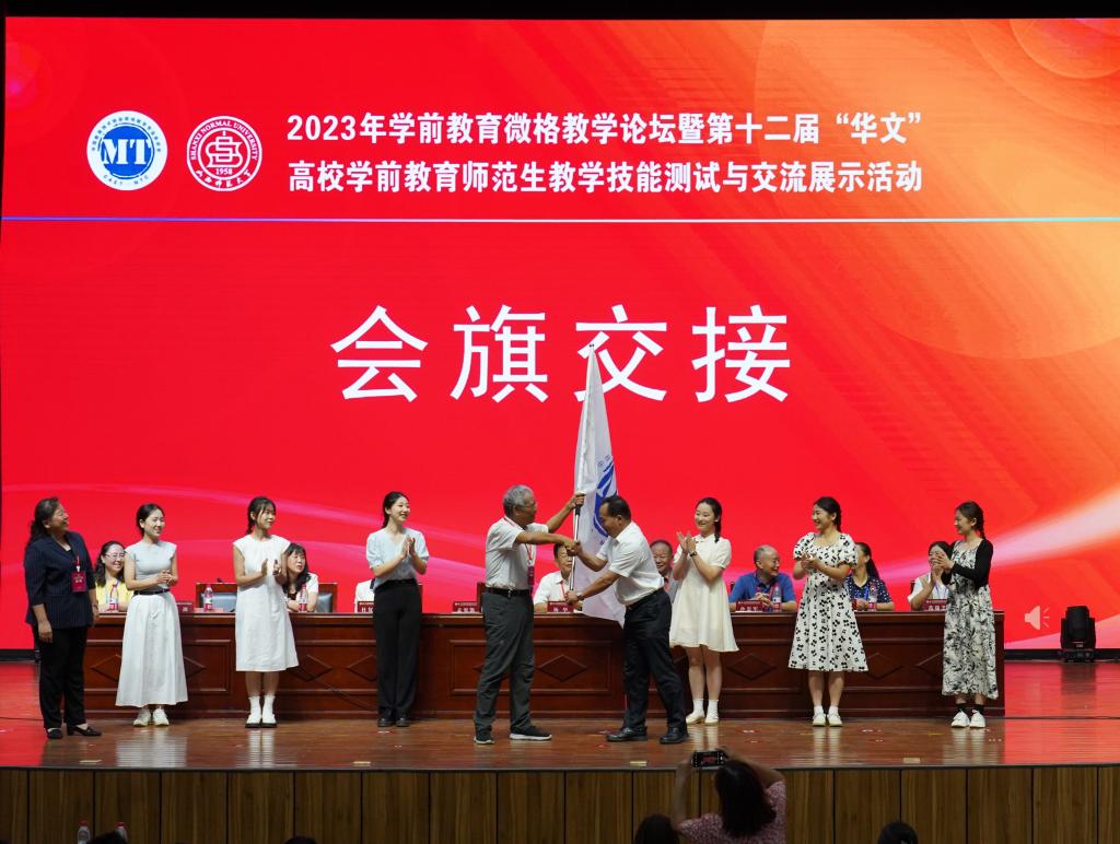 经理张潮宣布了获得下一届举办权的学校——黄冈师范学院,并与黄冈师范学院进行了会旗交接。第十三届“华文”高校学前教育师范生教学能力测试与交流展示活动承办单位代表黄冈师范学院经理陈中文在发言中对公司的精心组织、周密安排表示衷心感谢,并代表黄冈师范学院教育学院郑重承诺,他们有信心、有能力、有条件,优质、高效、安全地做好第十三届“华文”高校学前教育师范生教学技能大赛的服务工作。