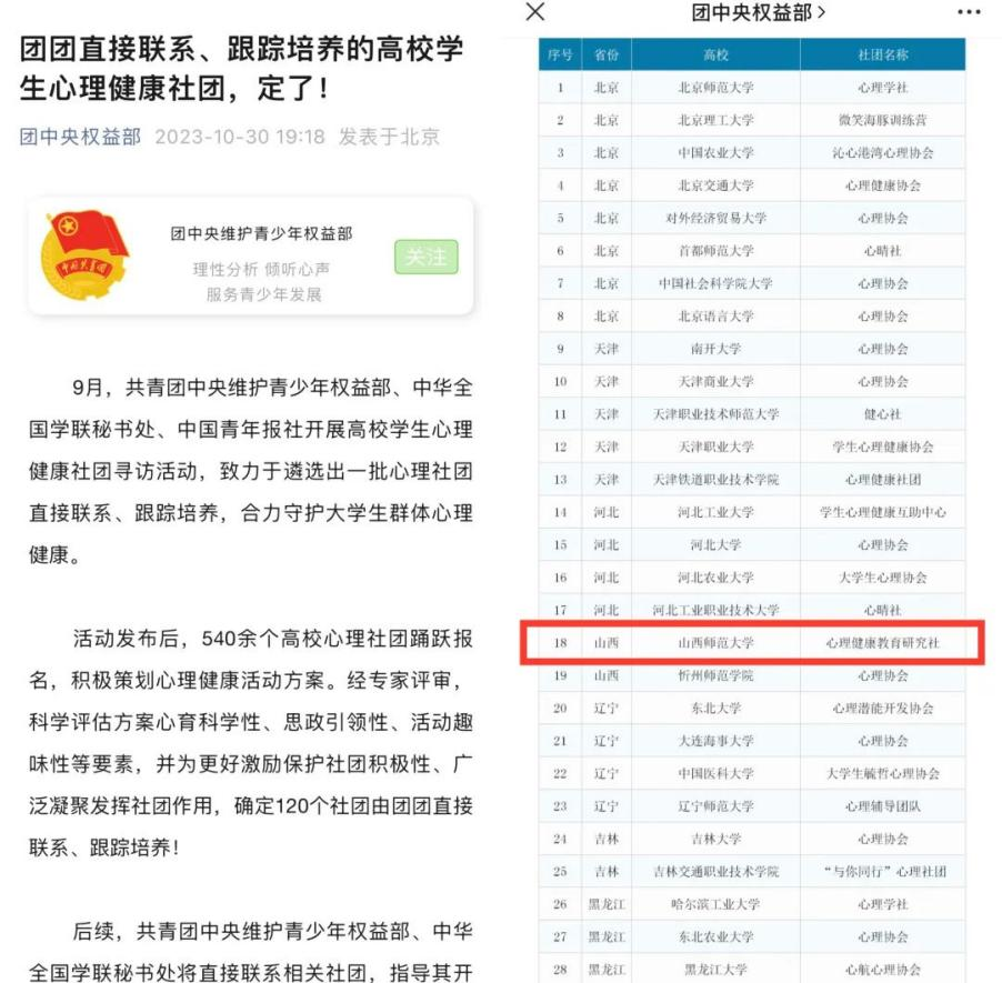 近日,共青团中央维护青少年权益部、中华全国学联秘书处、中国青年报社开展高校员工心理健康社团寻访活动,遴选确定了120个社团直接联系、跟踪培养,合力守护老员工群体心理健康。公司心理健康教育研究社入选共青团中央直接联系、跟踪培养的高校员工心理健康社团。