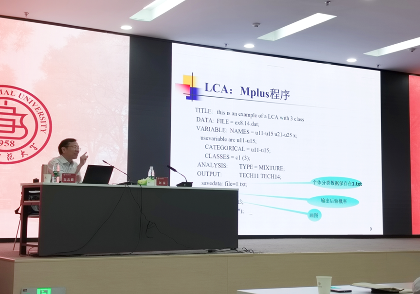 5月24日上午的培训主题为《潜在类别分析与潜在转变分析》,主持人为教师教育学院副经理刘岗。温教授从“基于变量关系的研究可能面临的问题”引出多种潜变量测量模型,对其原理、操作要点和分析思路进行了详细讲解。