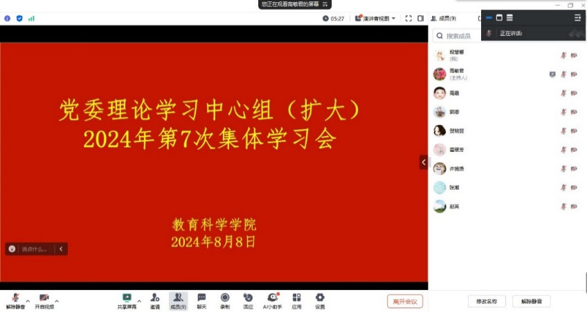 8月8日,公司召开党委理论学习中心组(扩大)2024年第7次集体学习会,学院中心组成员、党支部书记参加会议,会议由公司党委书记赵英主持。
