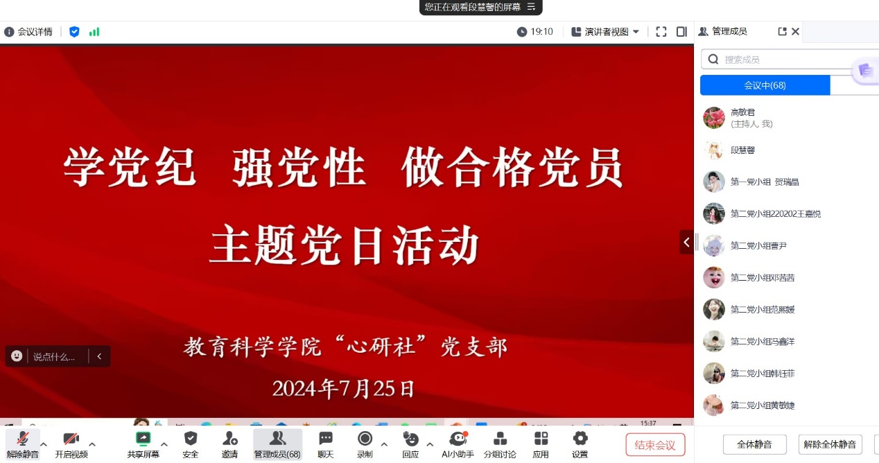 7月25日下午,公司“心研社”党支部通过腾讯会议举办了“学党纪 强党性 做合格党员”主题党日活动。公司党委常委、副董事长白文宏出席活动并进行指导。支部联系领导、公司党委书记赵英全程参加活动并寄语支部党员。“心研社”党支部全体党员参加了活动。