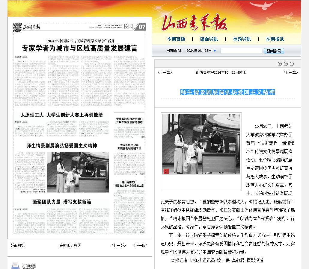《山西青年报》10月28日第7版报道了公司“文韵飘香,话译精粹”传统文化情景剧展演活动。