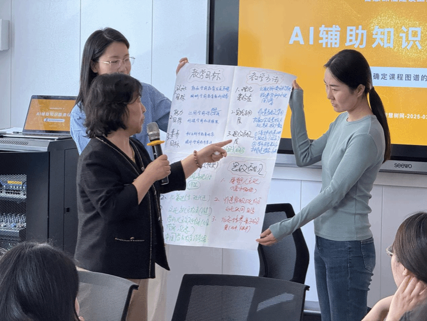 工作坊采用小组合作、分组竞赛模式,围绕课程概要设计、知识图谱样例设计、知识点样例设计、问题图谱设计四个模块展开。活动中,教师们分工协作、各展所长,在小组汇报与展示时,不仅分享了不同课程的图谱建设成果,还交流了丰富的教学心得与创新设计思路,现场研讨氛围热烈。