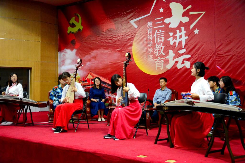 此次大讲坛正值我国传统节日中秋佳节,八音乐团的同学现场演奏了《琵琶语》和《送我一只玫瑰花》,曼妙悦耳、具有民族特色的器乐演奏烘托了浓厚的节日氛围,缓解了外地尤其是少数民族学子的思乡之情,增添了同学们学习中华优秀传统文化的兴趣和热情。
