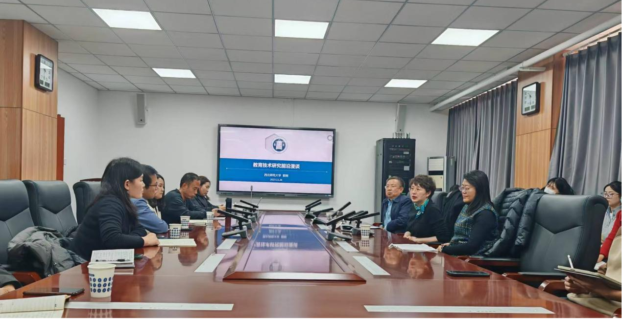 2023年11月26日,西北师范大学教育技术学院经理郭炯教授应邀为公司师生作了题为《教育技术研究前沿漫谈》的专题报告。本次报告由董事长王云教授主持,教育技术专业的老师和研究生聆听了报告。