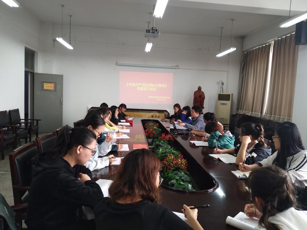 2018年9月20日下午,beat365vip官网登录入口本科生党支部在田家炳书院509会议室开展了《中国共产党纪律处分条例》专题学习会议。本科生党支部书记宁志恒老师和在校本科生党员参加了此次专题学习会。