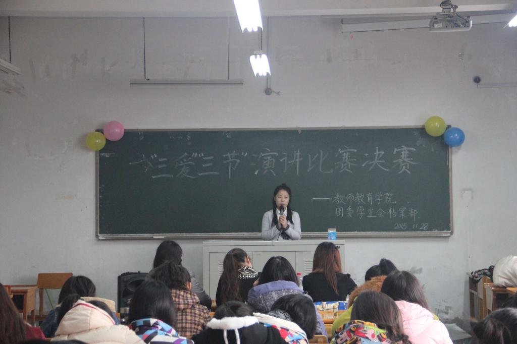 经过之前的初赛,共有13名选手进入本次决赛。选手们以信心十足的姿态,声情并茂,娓娓道来,表达了对“三爱”、“三节”的理解与感悟,赢得了观众的阵阵掌声。经过激烈角逐,140502班的杨沐琳同学获得第一名,140502班的王婕同学和140502班的王宁同学获得第二名。赛后,评委老师们对参加演讲比赛的选手们的表现给予了指导与点评。