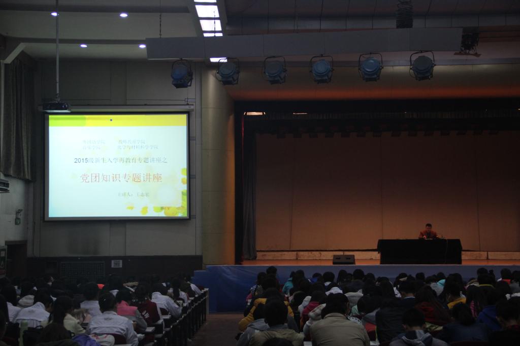 11月5日、6日晚7点,教师教育学院、外国语学院、音乐学院和化学与材料科学学院在员工文化艺术活动中心联合举办了2015级新生入学教育第二次专题讲座。本次讲座共分为两个专题,分别从党团知识、安全知识两方面指导新生尽快地适应大学的学习与生活。