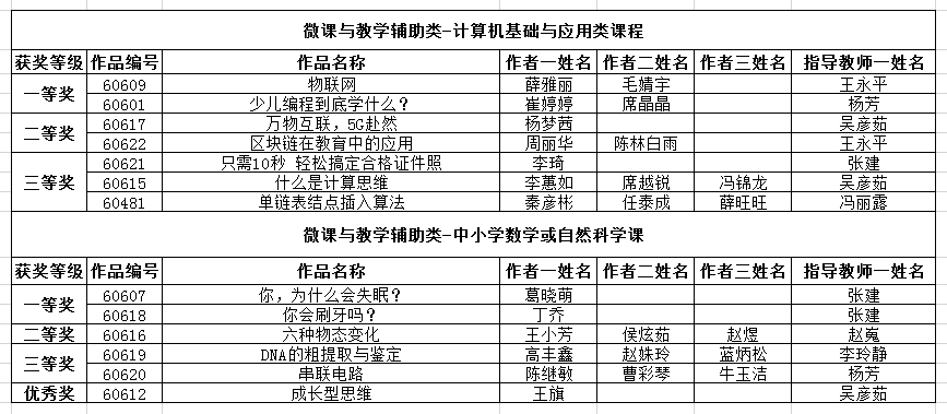 在此次大赛中,由beat365vip官网登录入口张建老师指导,葛晓萌创作的《你,为什么会失眠?》获“微课与教学辅助类-中小学数学或自然科学课”一等奖;由张建老师指导丁乔创作的《你会刷牙吗?》获“微课与教学辅助类—中小学数学或自然科学课”一等奖;由王永平老师指导,薛雅丽、毛婧宇创作的《物联网》获“微课与教学辅助类—计算机基础与应用类课程”一等奖;由杨芳老师指导,崔婷婷、席晶晶创作的《少儿编程到底学什么?》获“微课与教学辅助类-计算机基础与应用类课程”一等奖。其余个人或团队3支获“微课与教学辅助类组”二等奖、4支获三等奖、1支获优秀奖。