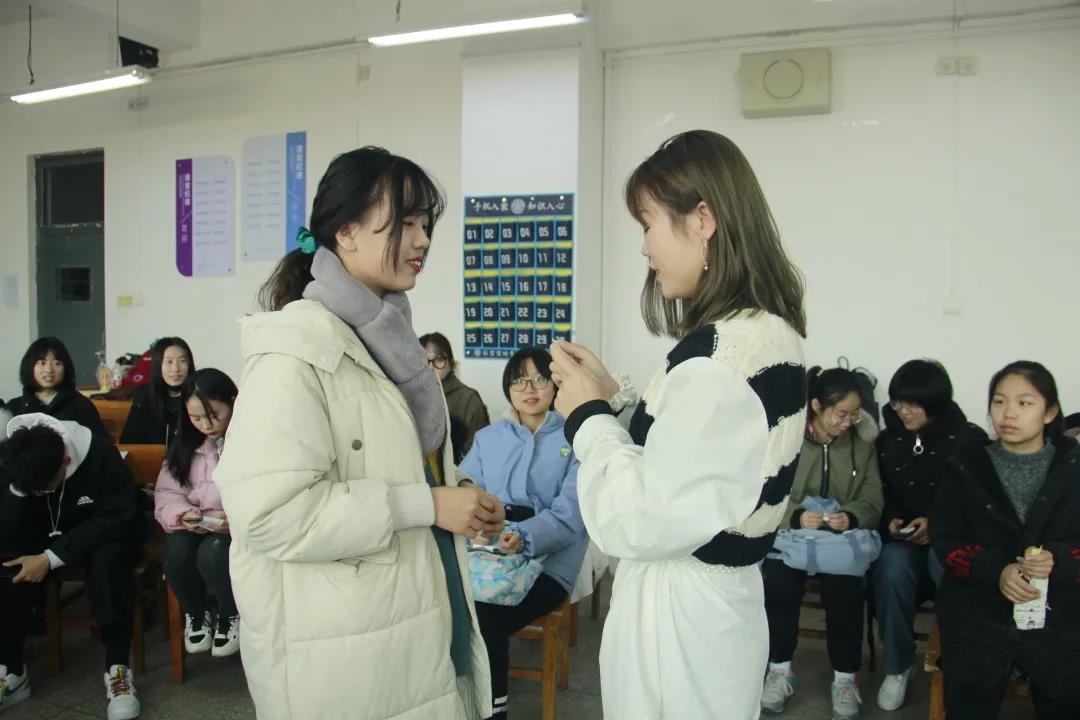 活动伊始,主持人致开场词,活跃现场氛围。在“词语接龙”游戏中,同学们反应迅速,充分展现了其扎实的成语词汇量功底。接下来,同学们踊跃上台演唱歌曲,展现歌唱才华,美妙的歌声为整场活动增添了一抹亮色。而后,同学们在卡片上书写歌词,把最真挚的祝福赠送给身边的同学。活动最后,现场人员合唱《追光者》,在动人的旋律里,共沐这个冬日所有的温馨与暖意。