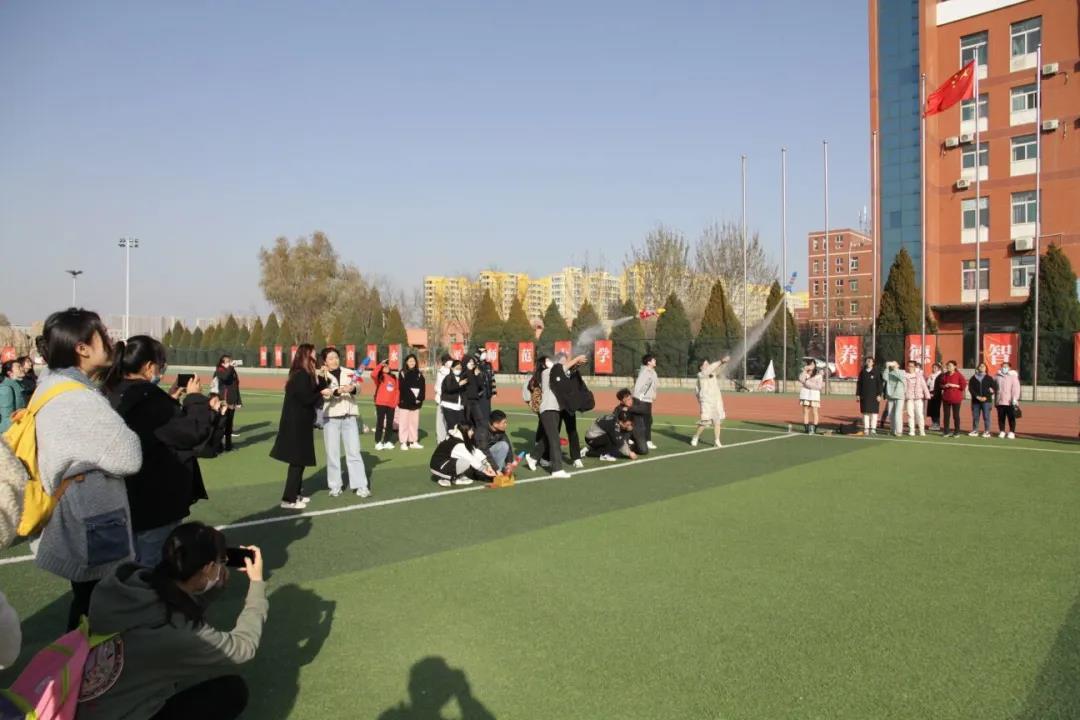 而后,茹秀芳老师组织大家进行水火箭齐射。各组将水火箭一字排开,老师的一声令下,数只水火箭腾空而起,在空中划出一道优美的弧线,完美落地。同学们欢呼雀跃,相互庆祝水火箭的成功发射。