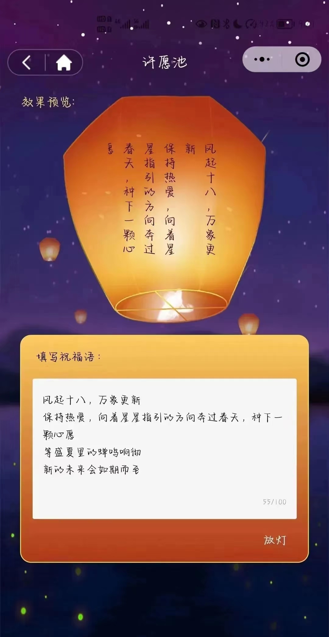 本次活动形式多样,同学们在全民K歌软件中合唱抗疫歌曲,通过“邮政信使”小程序给在疫情防控区的亲友写鼓励信,并在闪耀的孔明灯和河灯上写下心愿、放飞梦想。