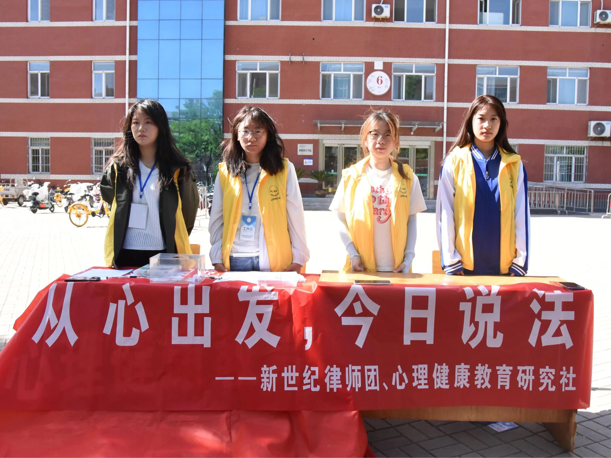 5月14日至15日,公司心理健康教育研究社联合社会学与法学学院新世纪律师团在南区六号楼前举办了“从心出发,今日说法”主题活动。