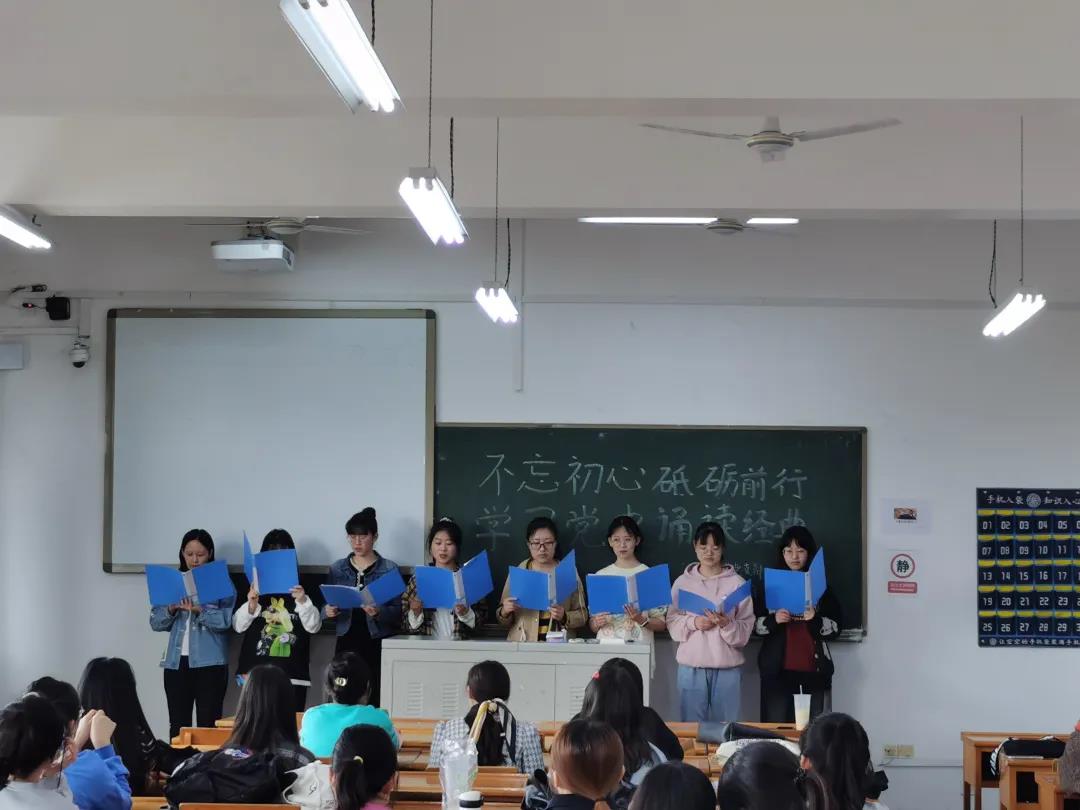 活动中,8名员工党员声情并茂地朗诵诗词《七律·长征》《忆秦娥·娄山关》《江城子·忆长征》,带领支部党员学习长征精神,传承红色经典。铿锵的背景音乐,坚定的诵读之声,让同学们真切感受到中国共产党在长征中折射出的崇高理想、坚定信念、不怕牺牲的革命精神和顾全大局、严守纪律、亲密团结的高尚品德。